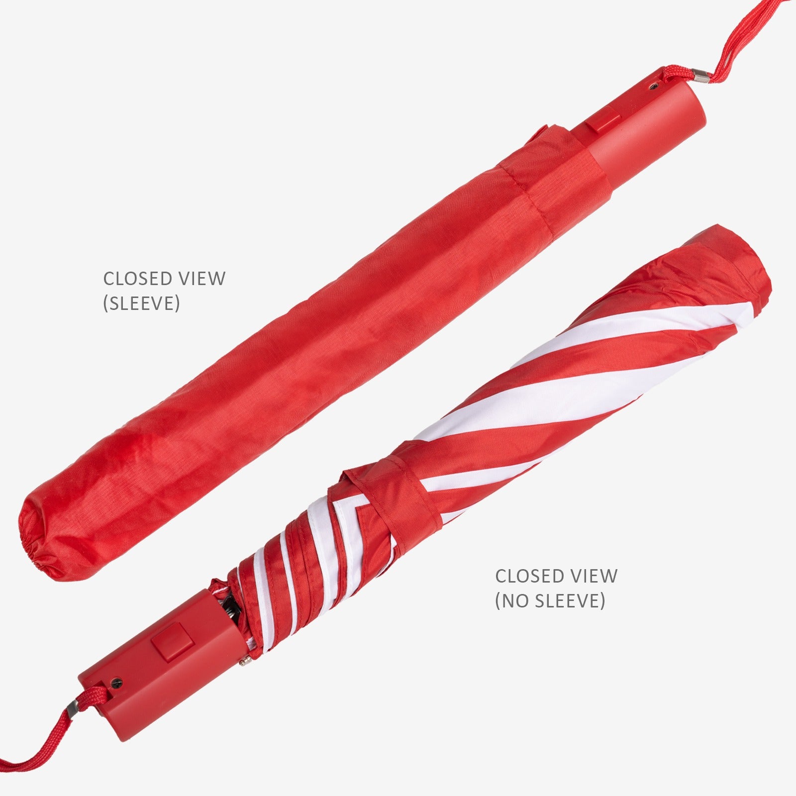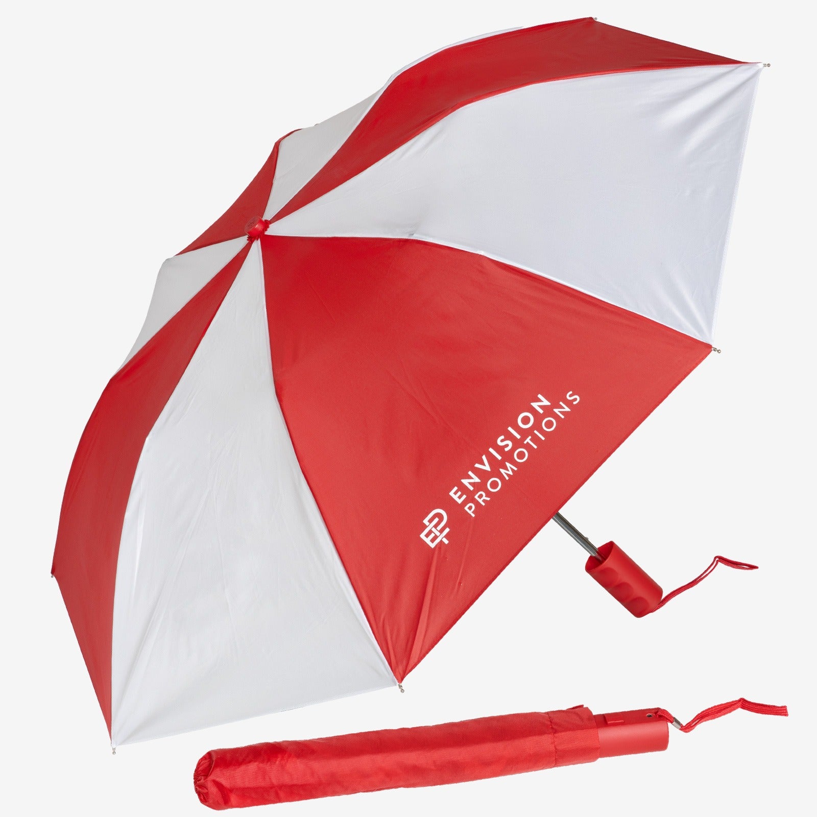 Select a useful promotional product that’s also a best seller! A great way to promote any business, the Revolution umbrella features a 42″ arc, automatic opening and machine tips. Made of nylon on a wind reflex frame for durability in wet and windy weather conditions. Should the frame get caught inside out, a good shake will get it back in shape without causing any damage. Each umbrella is enhanced with a matching color rubber spray handle and matching nylon sleeve so it can be taken on the go or stored away safely in a closet.