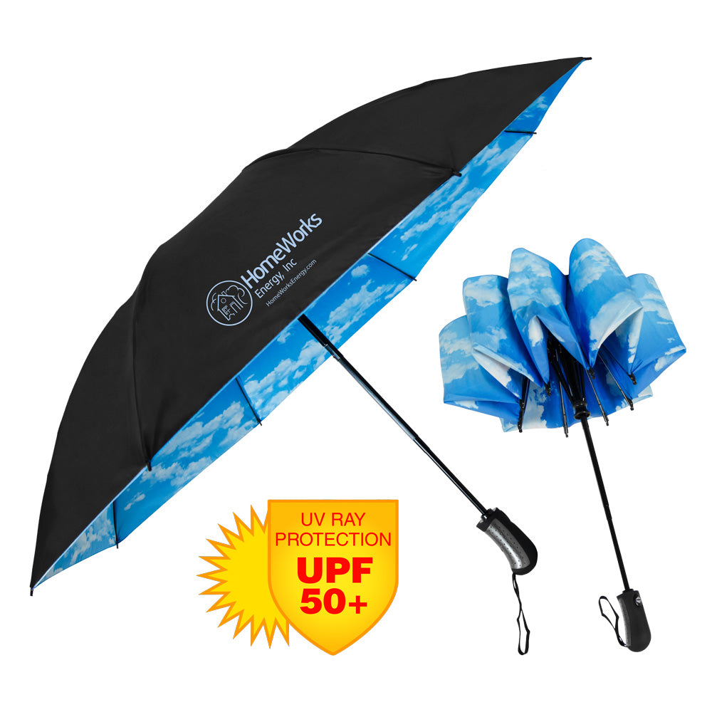 When it comes to effective promotional gift giving, “the sky’s the limit” with our auto-open/auto-close Skyview Inverted Folding Umbrella! Featuring an eye-catching 46″ arc with a vibrant blue sky and clouds undercanopy (black upper canopy), the high-quality SkyView closes in reverse fashion, keeping the wet side of the umbrella contained and away from you. This design makes it easy to open and close anywhere, while keeping you dry from start to finish. Its compact folded length of only 13″ means easy storage, so you can take it with you anywhere you go – rain or shine!